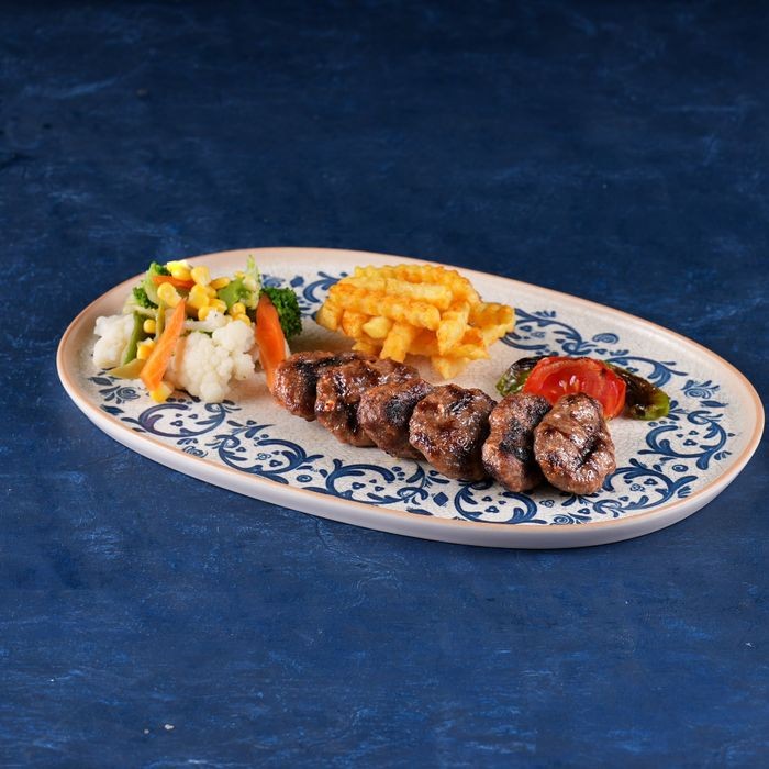 Kuşbaşı dana bonfile, Kuşbaiı tavuk talex, Şiş köfte, Sebze mix, Patates cips, Lavaş, Dip sos